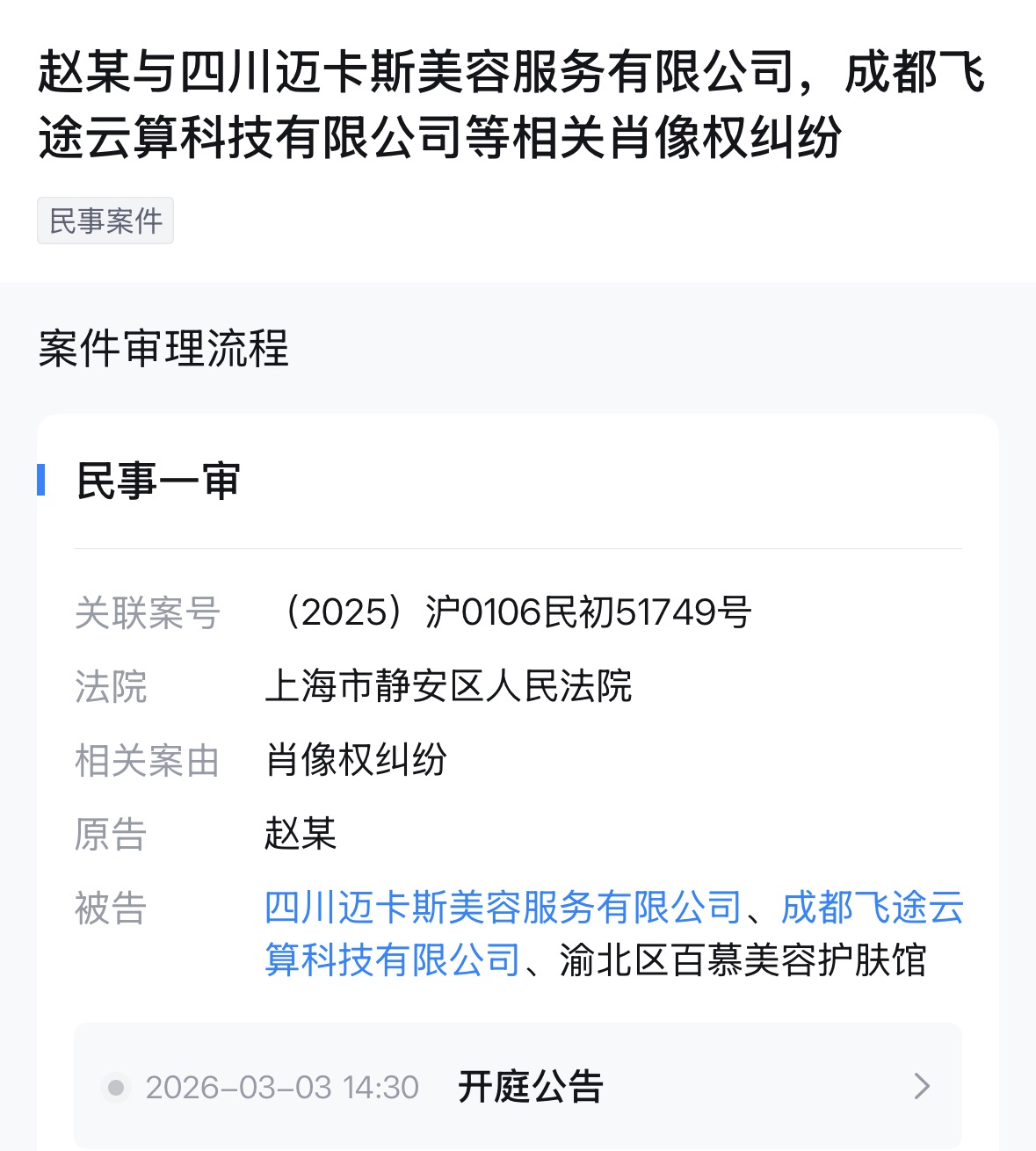 日前,围绕演员赵丽颖起诉多家公司侵犯其肖像权的纠纷案件引发关注,天眼查App显示,赵丽颖与四川迈卡斯美容服务有限公司、成都飞途云算科技有限公司、渝北区百慕美容护肤馆相关肖像权纠纷案件新增一则开庭公告,原告为赵丽颖,该案将于2026年3月3日在上海市静安区人民法院开庭审理。