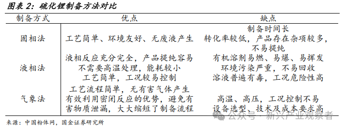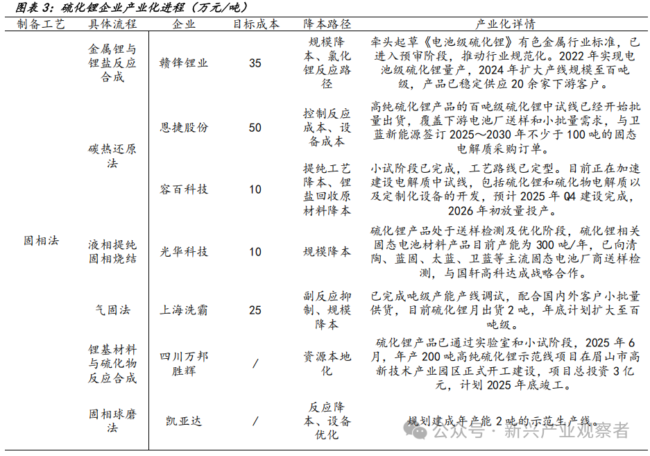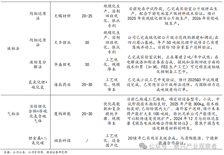 总体:当前硫化锂产业化仍处于早期中试阶段,多种工艺路线并行发展,尚未形成定论。固相法虽在产能建设上领先,但面临降本压力,相关企业正通过工艺复合与原料回收等技术积极探索降本路径。而液相法与气相法则在反应条件和流程集成方面展现出潜在的成本优势,但仍需突破规模化生产的瓶颈。