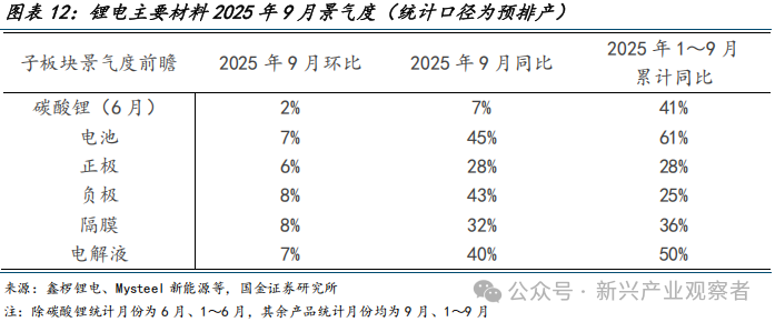 9月锂电排产跟踪:环增2%~8%,同增7%~45%。2025年1~9月,碳酸锂/电池/正极/负极/隔膜/电解液预排产累计同比预计达25%~61%,其中单9月电池、负极、电解液同比超40%;各环节排产环比小幅上调,主要系因金九银十车市旺季、储能需求超预期等,各厂商订单普遍增加,需求端逐渐回暖。