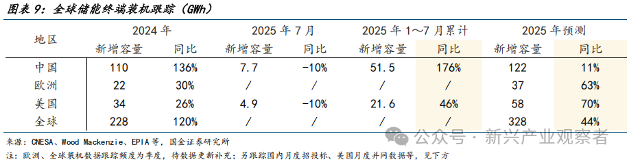 我们在2025年中期策略中预测,中国/欧洲/美国/全球新增容量的同比增速分别为11%/63%/70%/44%。2025年1~7月国内累计同比增速达176%,显著高于预测值;美国7月储能并网4.9GWh,同比-10%、环比29.4%;1~7月累计装机21.6GWh,累计同比+46%,7月初美国签署修改后ITC法案,整体边际利好储能经济性,环比增长显著。