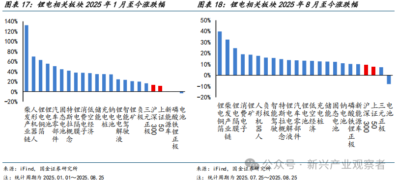 2025年8月以来,多数板块实现上涨,其中锂电铜箔板块实现领涨,涨幅达40%,此外本月仅电池板块呈现下跌态势,下跌幅度为-8%。