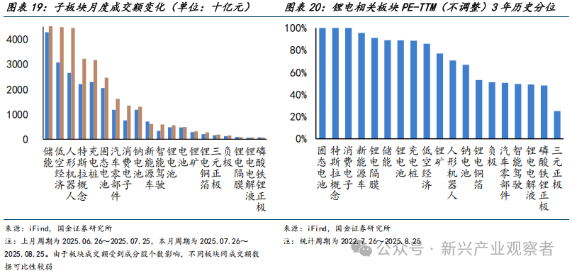 2025年8月以来,锂电板块表现较为活跃,多数环节跑赢沪深300和上证50指数。锂电铜箔板块实现领涨,涨幅为40%;仅电池板块呈现下跌,下跌幅度为-8%。本月锂电相关板块多数环节月度成交额持续增长,主要系人形机器人等板块资金交易活跃。本月过半锂电相关板块的3年历史估值分位处于高位,市场对锂电板块关注度走高。