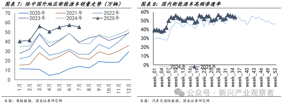 我们在2025年中期策略中预测,2025年中国/欧洲/美国/全球新能源车增速预计分别为25%/20%/10%/23%。截至2025年1~7月,中国销量累计同比增速达37%,显著高于预测值,主要得益于“两新”政策持续发力,第三批补贴于7月份下达。以及零跑汽车、小鹏汽车等多家厂商新能源批发销量创历史新高,推动国内销量形势向好。欧洲十国1~7月累计同比增速达30%,但环比数据除德国外整体呈现下滑趋势。其中英国政府于7月15日重启电车补贴,虽在车型和价格对消费者购车有所限制,但从长期来看仍有利于新能源车市场发展。此外,西班牙的MOVESⅢ补贴计划以及购买电动汽车的15%个人所得税减免延长,有力推动了当地电动化转型,至使同比增速持续走高。其他如奥地利、意大利和丹麦等国较上月市场增速有所下降。但受欧Ⅶ排放法规影响,于去年相比同比数据仍保持强劲的增长势头,推动传统汽车制造商加速电动化转型。除此之外,美国市场受“大而美”法案影响,美国政府从今年9月30日起将不再为电动汽车提供税收抵免。为享受7500美元的税收抵免,消费者抢先购买的同时,经销商也通过活动或折扣的手段相继减少库存,短期内提振了市场需求。