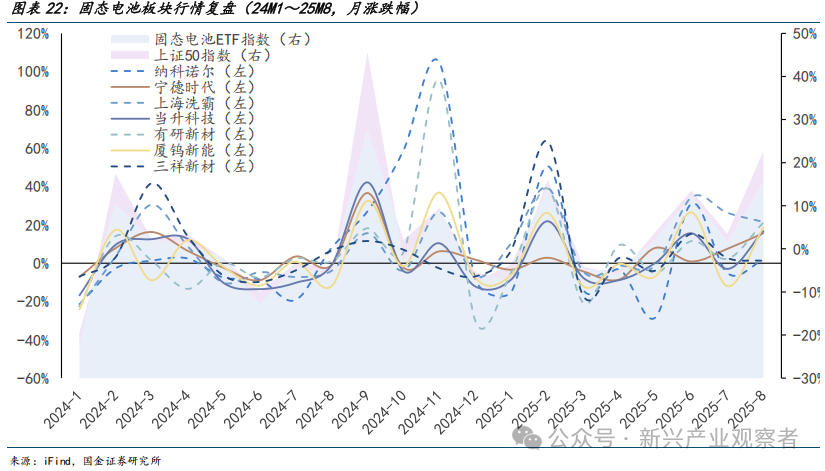 新技术:固态设备公司订单超预期,步入工信部中期审查及中试线搭建等密集行情催化期。头部锂电设备厂指引固态订单超预期,年化同比近高倍数增长。从行业事件看,工信部投入60亿元固态电池专项研发项目预计在2025年底前进行中期审查,重点解决量产工程问题;此外2H25~1H26为行业固态中试线集中落地关键期,中试线落地标志着科学问题解决转向量产优化,带动设备招标及材料体系定点等,预计持续提振市场信心和资金流入。