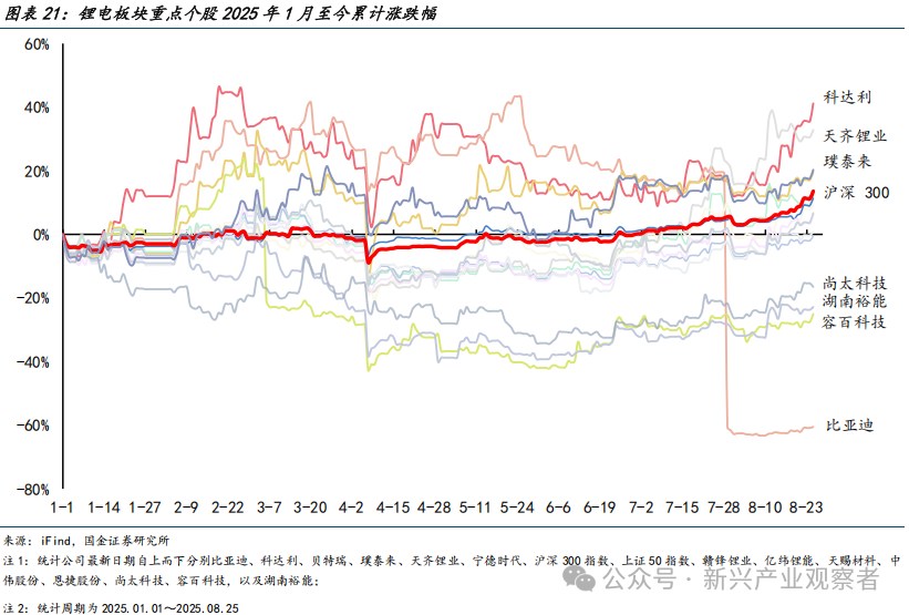 2025年年初至今,板块重点公司科达利(+41.2%)、天齐锂业(+32.8%)、璞泰来(+20.3%)、贝特瑞(+19.7%)股价上涨并跑赢沪深300指数(+13.6%);赣锋锂业(+12.1%)、宁德时代(+9.1%)、亿纬锂能(+6.7%)、天赐材料(+6.2%)、恩捷股份(+0.8%)股价上涨;中伟股份(-0.5%)、尚太科技(-16.5%)、湖南裕能(-22.5%)、容百科技(-25.0%)、比亚迪(-60.5%)股价下跌。