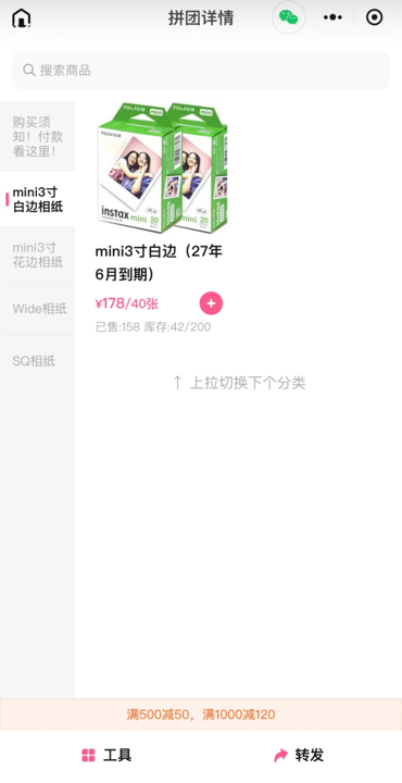 目前,相关拼团在小程序已无法查看,记者从消费者提供的截图中看到,“koi”开设的某团mini相纸售价为178元/40张,比“运佳数码”的价格更便宜。以远低于市场价的价格吸引顾客,这便是这些拍立得拼团发展壮大的第一步。