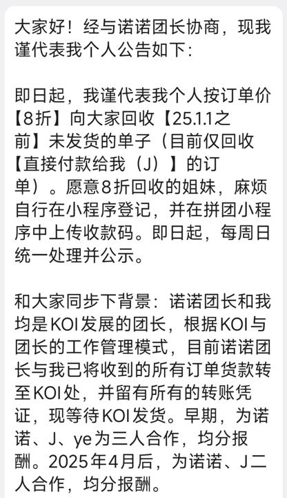 除了“运佳数码”,还有更多消费者选择在一家名为“koi”的拍立得拼团购买相关产品,资深拍立得爱好者z女士告诉记者,从2024年下半年起,“koi”开始售卖拍立得相纸和相机,一开始为直营模式,后来发展到招募团长开团,团长从“koi”处折扣购买产品,随后售卖给团员,形成这种“大团带小团”的模式,直到今年上半年,部分团发货开始变慢,不少团员持续质疑“是不是跑路了”。而近期,所有的小团都已不再发货,部分团长回复“koi联系不上了”,消费者们开始维权。