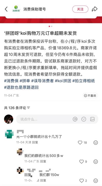 在黑猫投诉平台检索“拼团”,出现的投诉大部分与这类拍立得拼团相关,不少消费者的未发货金额达千元,在“koi”联系不上后,有团长开启了“折扣退款通道”,宣称将以八折等折扣退还消费者在拼团消费的金额,但就目前的退款状况看,不少团长在退还了一些小额订单后不再回复消息。记者加入了一个名为“胶个朋友”的拼团维权群,群内60余名消费者,消费金额粗略合计约17000元,而这只是该拼团的极少一部分消费者,在社交媒体平台,不少参团消费者表示统计金额已高达百万元。