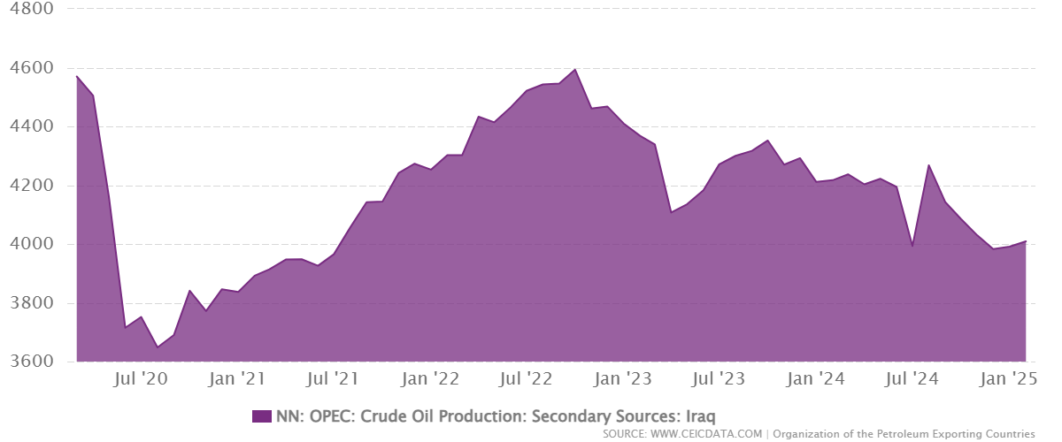 △CEIC数据统计:伊拉克石油日产量变化(2020年7月-2025年1月)